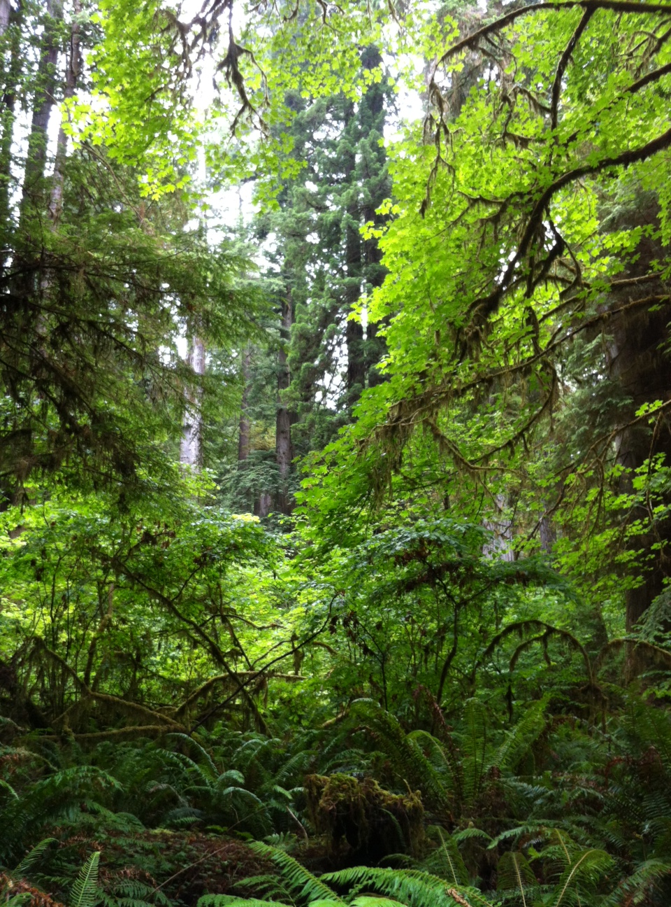 I spent this week transversing through the lush understory of Jedediah Smith Redwoods State Park, home to several of the largest coast redwood trees on Earth. It is the greenest place I’ve ever wandered through with tiny redwood sorrel underfoot, spiky ferns flanking the trails, moss-covered trunks reaching skyward, and a sea of leaves in the canopy overhead. Every plant seems to display leaves of its own shade of green, a clue as to how long the leaves will live. The sturdy, long-lived leaves of the redwood tree are deep, dark green while the delicate, short-lived leaves of the springtime flower trillium are light green.