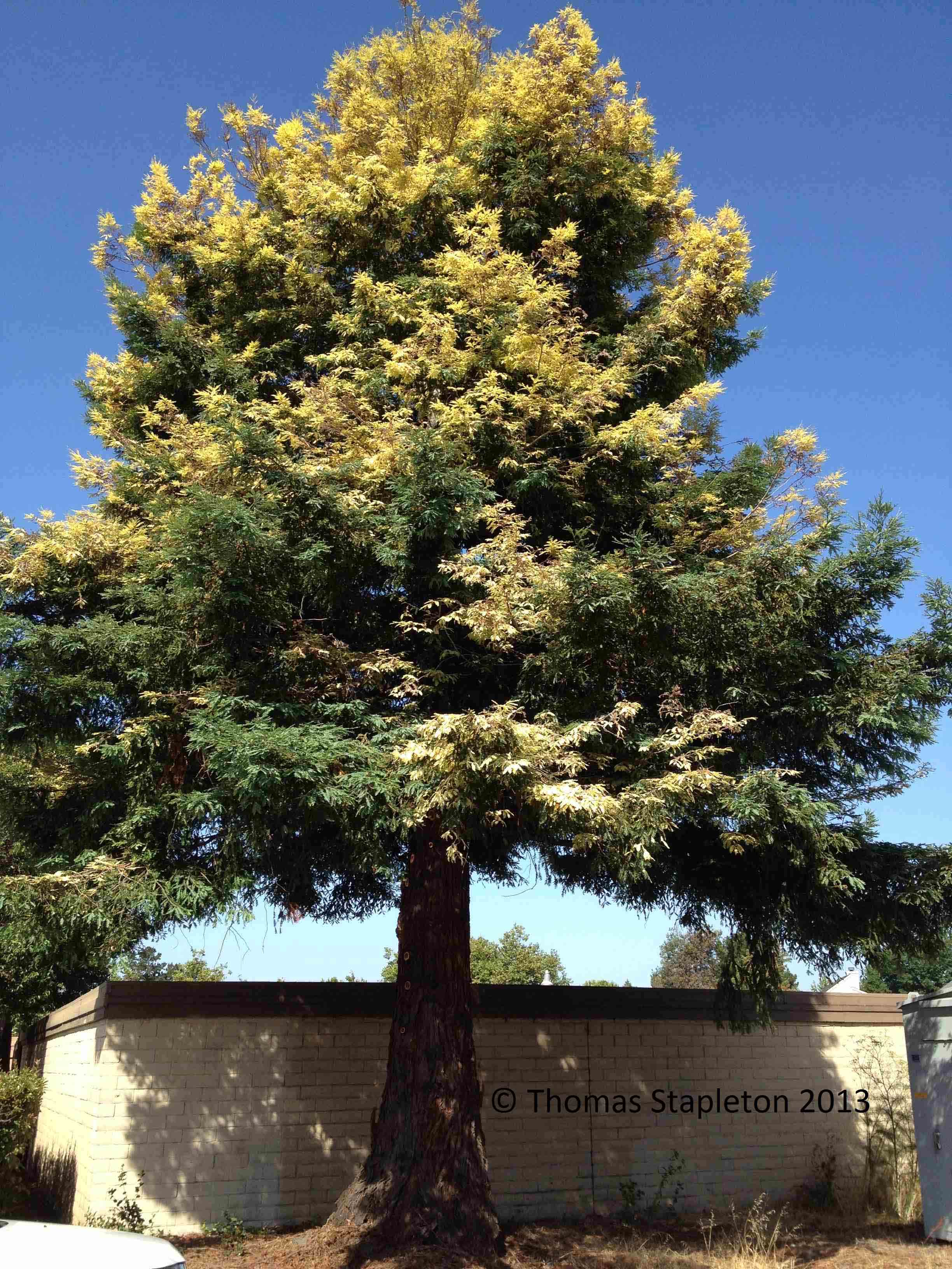 An albino chimera redwood stands 52 feet tall in Cotati, CA displaying both green foliage and distinct white leaves. This chimera dramatically shows its mixture of two genetically distinct tissues. It is incredibly rare and unfortunately may become even rarer.