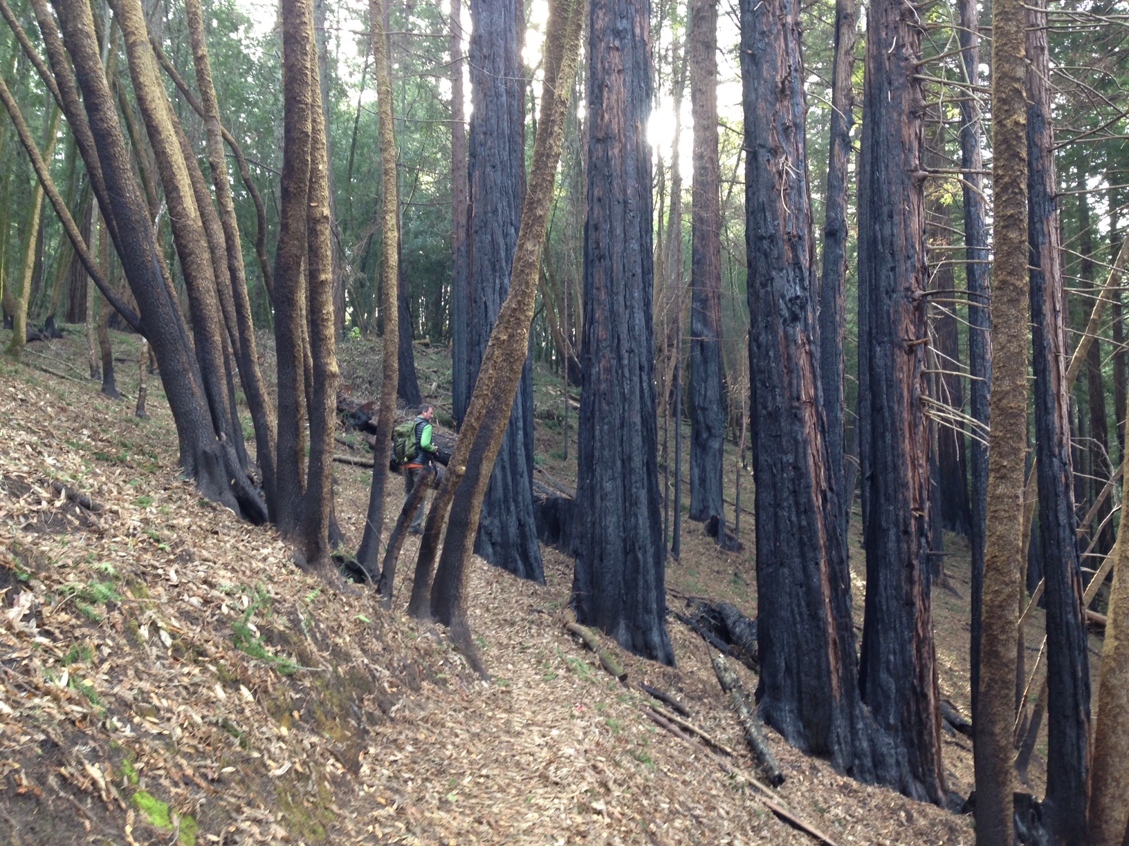 Roys Redwoods Fire-burned stand and hiker