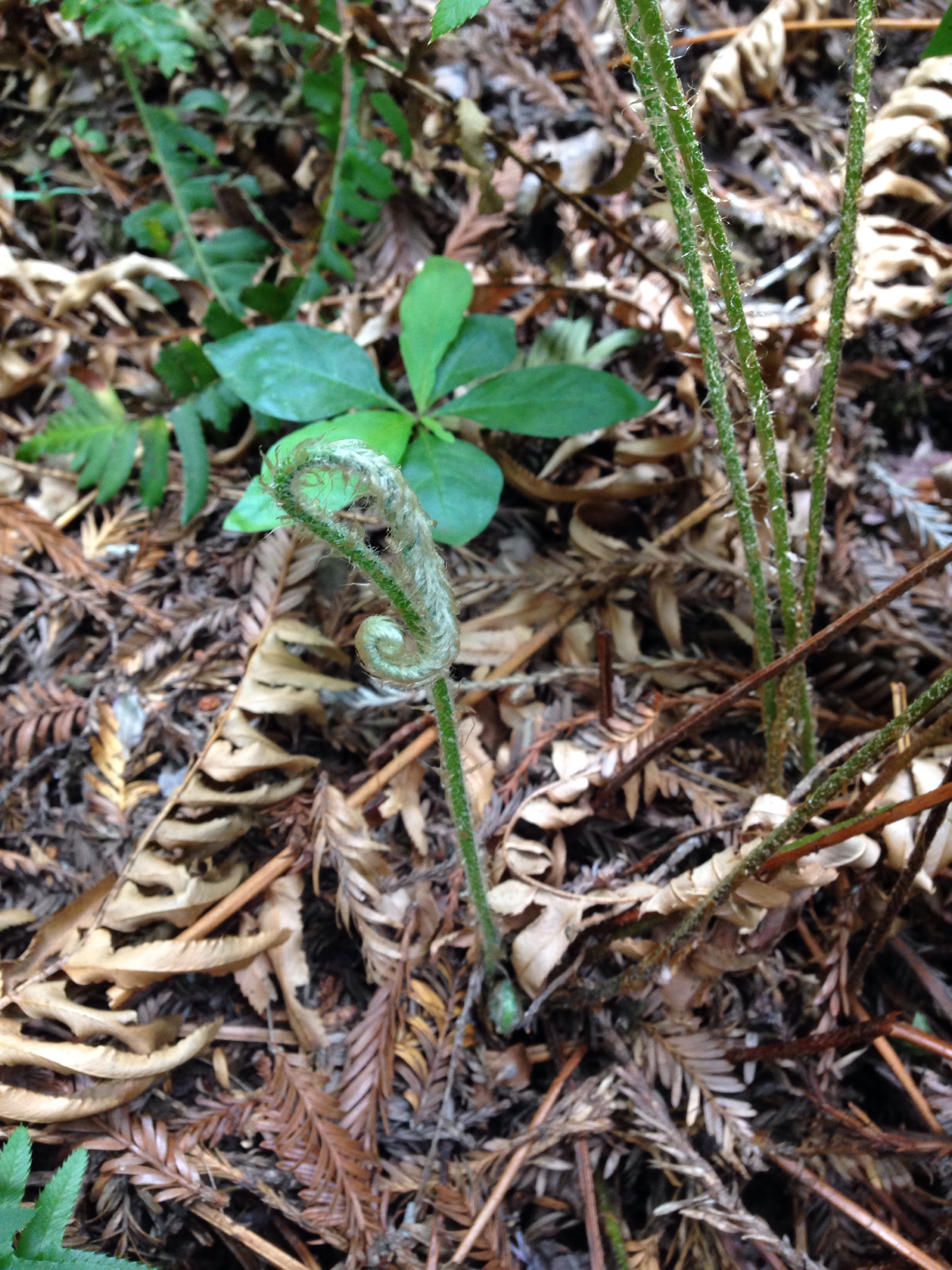 In the fourth year of California’s drought, I was surprised to find late breaking new fiddleheads in the redwood forest this week. Sword ferns at UC Santa Cruz, Redwood Regional in Oakland, and Muir Woods are pushing up unexpected new leaves. I track the health of new sword fern leaves annually and was reliably able to study the fully-formed leaves by this time of year in years past. With dry and warm weather typical of the last few springs, I’m accustomed to the ferns setting their new leaves early while winter water was still available to support their growth. This year however, the ferns seem to be taking advantage of the unrelenting, cool and clammy weather that has dominated our Northern Californian spring.