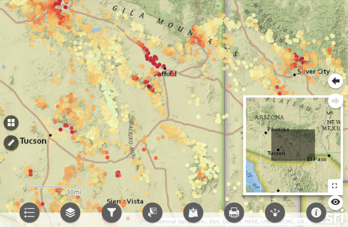 Our Sky Island region is estimated to have 10,000 springs—places where groundwater comes to the surface and provide vital water for plants, wildlife, and people. That is a huge number of water sources to track and care for across Arizona and Sonora, but we’re up for the challenge! To help us understand which springs need our help most, we developed a Spring Prioritization Tool to compare the relative risk springs across the landscape face today. This approach allows us to understand across the Sky Islands where springs face severe threat from groundwater pumping, watershed erosion after fire, invasive species, lack of available drinking water for wildlife, or other threats, so we can plan stewardship treatments at high priority spring to enhance water flow and habitat.