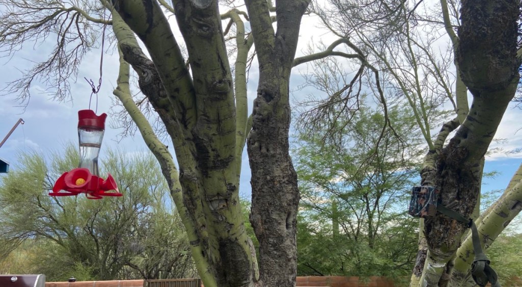 If you have a hummingbird feeder, a camera mounted nearby is likely to witness not only the amazing variety of hummingbirds that live in the Sky Island region, but also Gila woodpeckers, verdin, and migratory and nectivorous bats like the lesser long-nosed bat that migrates northwards from Mexico during the summer to follow the flowering of saguaro cactus and agave.