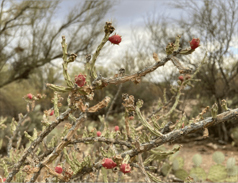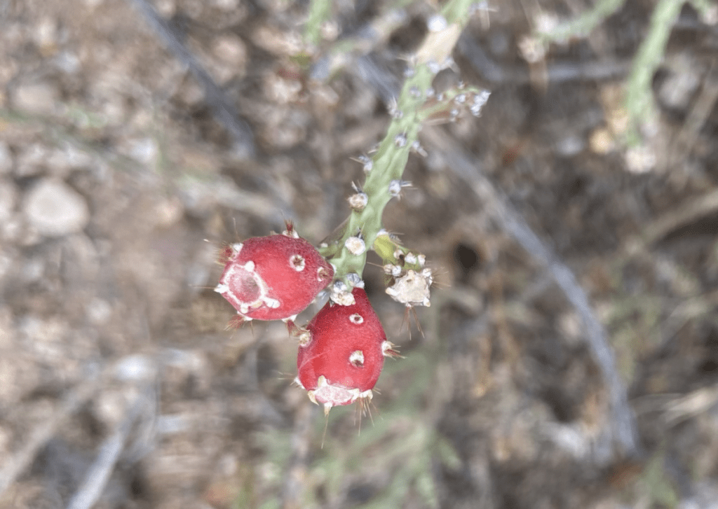 The red fruits are about half an inch long and resemble the fruits of prickly pear, only much smaller. As with the prickly pear fruits that are edible for people and wildlife, the Desert Christmas Cholla fruits are edible too. Instead of spines, the fruit exterior is adorned with patches of barbed prickles, also known as glochids.