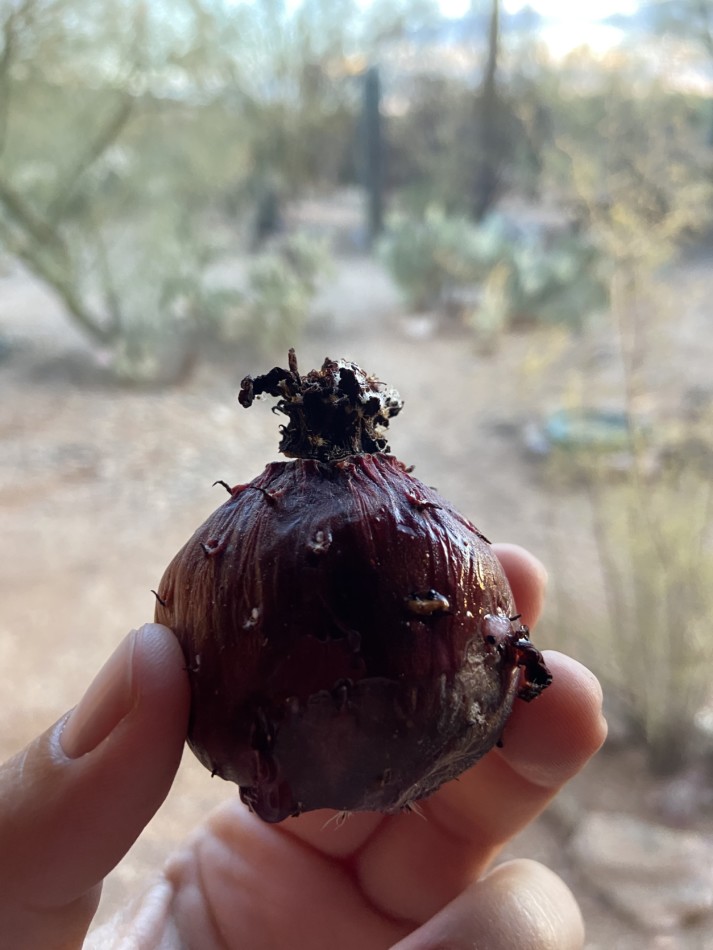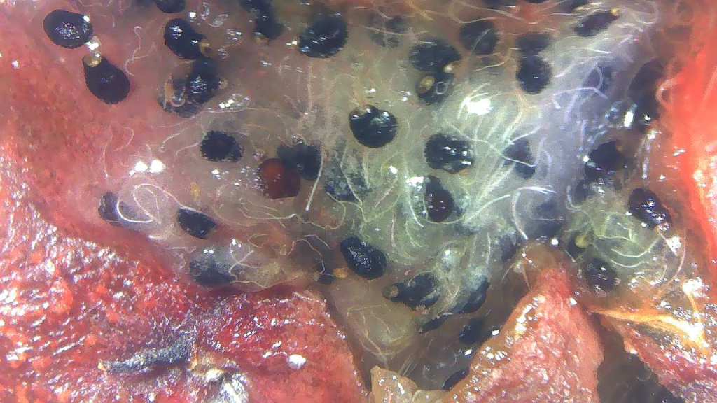 A close look at the pulp and seed of a hedgehog cactus fruit shows us the hundreds of seeds that wildlife, like birds and mammals, will disperse after eating this tasty meal.